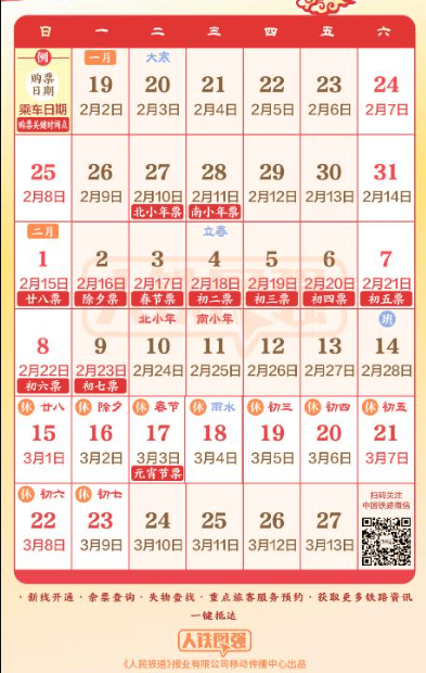 2026年铁路春运自2月2日开始,至3月13日结束,为期40天。春运首日火车票今日开始发售。今日起,铁路12306平台推出旅客误购限时免费退票服务,旅客购买乘车日期为2月2日及以后火车票时,如误购车票在购票支付成功30分钟内且在开车前4小时以上,购票人可线上自助办理退票,不收取退票费。